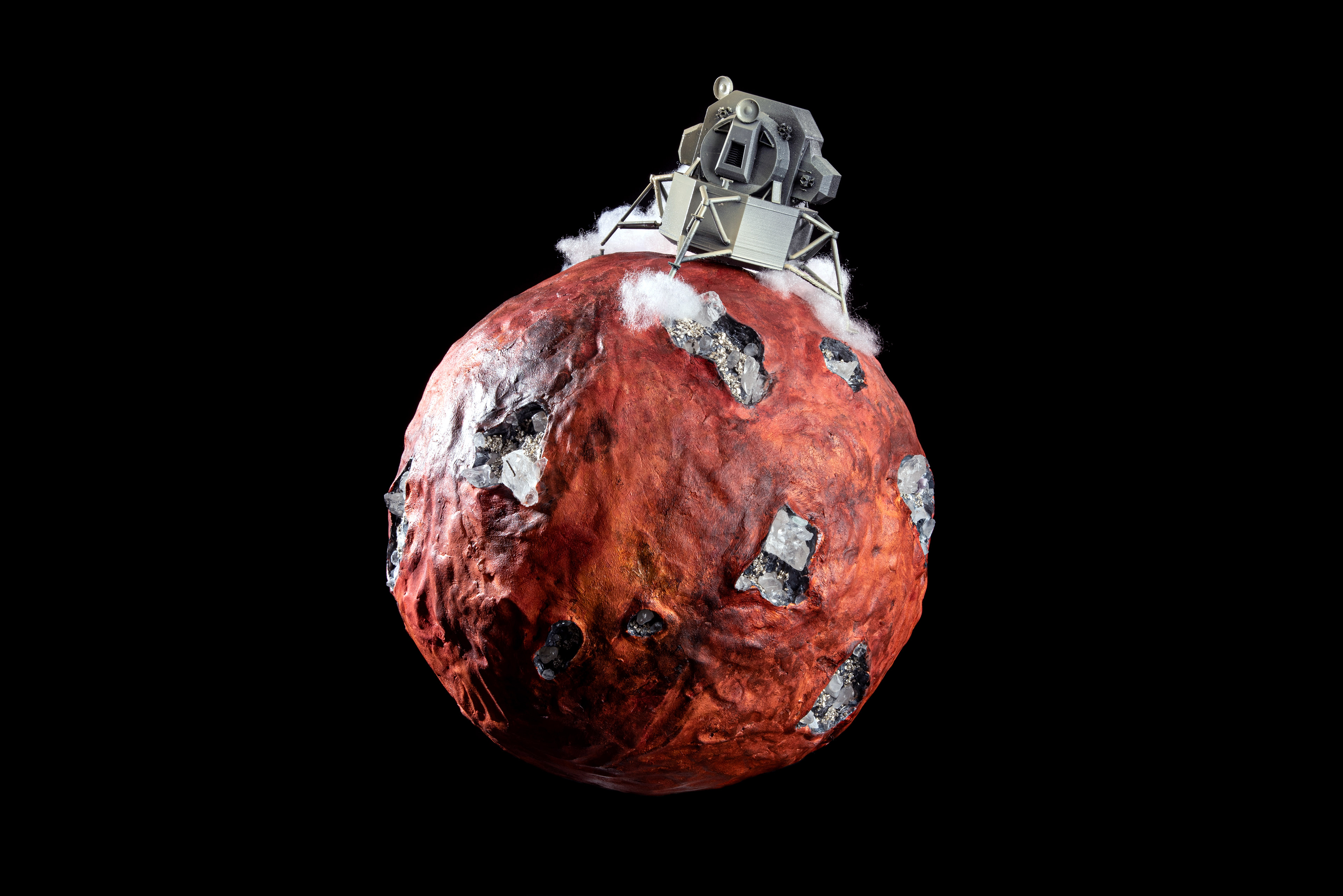 When I was younger, I wanted to be an astronaut. I treated that memory like something rediscovered rather than forgotten. I cut and hollowed a foam sphere, wired a small light source inside, then sealed it again. I carved craters into the surface, covered it with air-dry clay, and layered acrylics using a sponge to give it a scorched, timeworn look. The crystals symbolize fragments of imagination that never fully disappear. Even when dreams fade or change form, a part of their light remains beneath the surface. They grow from the craters like memories turned physical, proof that what once inspired us can still shape who we become. In the center, I placed a small spacecraft as if it had just landed on this weathered planet. It represents rediscovering my past dream, not as something lost, but as something transformed. The muted colors and rough textures make it feel like both a relic and a rediscovery.